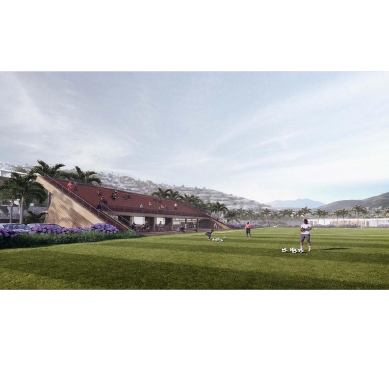 Uluslararası standartlarda futbol sahası, çocuklar ve gençler için Futbol Okulu, çok amaçlı spor alanları.