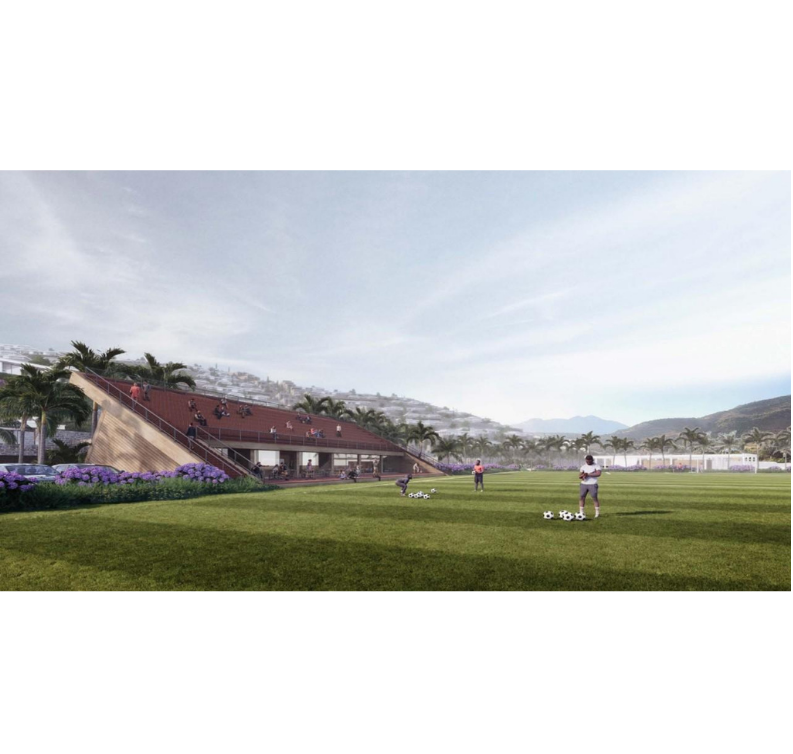 Uluslararası standartlarda futbol sahası, çocuklar ve gençler için futbol okulu, çok amaçlı spor alanları.