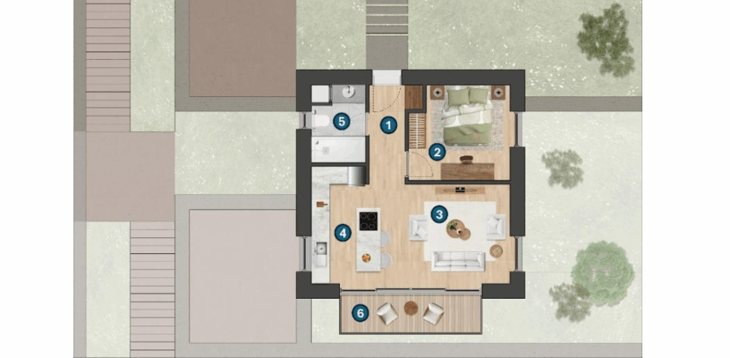 1. Giriş 2. Yatak odası 3. Salon 4. Mutfak 5. Banyo 6. Balkon