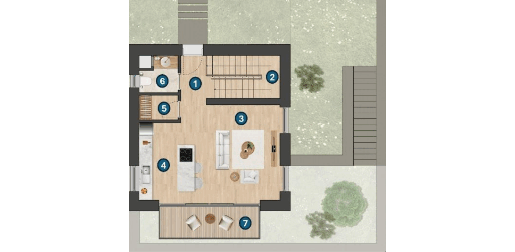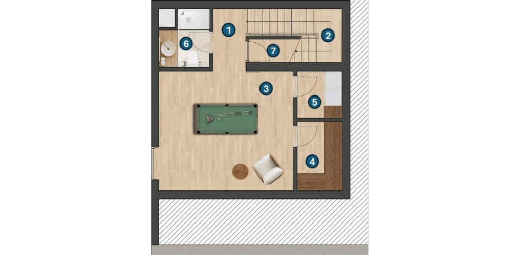 Alt Kat : 1. Koridor 2. Merdivenler 3. Hobi odası (Yatak odası) 4. Depolama alanı 5. Çamaşır odası 6. Banyo 7. Depolama alanı