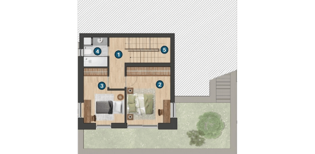 Orta Kat: 1. Koridor 2. Yatak odası 3. Yatak odası 4. Banyo 5. Merdivenler